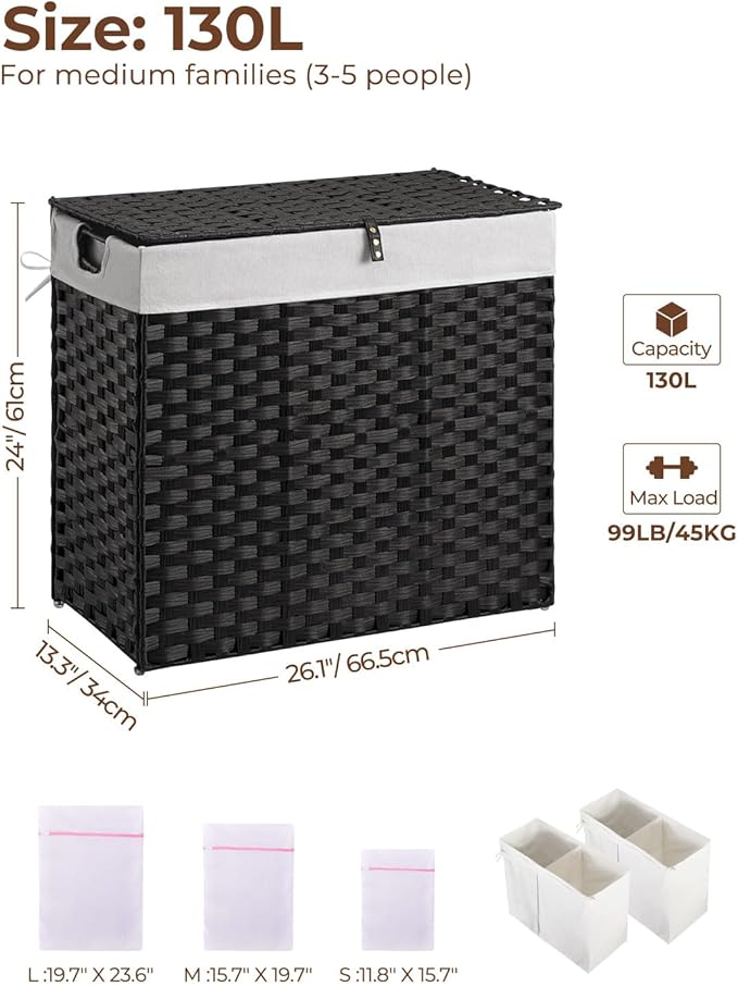 - Dimensions & Package Contents: Our laundry baskets are available in three sizes: 90L Size:18.3(L)*13.3(W)*24.0(H) inch;110L Size:22.2(L)*13.3(W)* 24.0(H) inch; 130L Size:26.2(L)*13.3(W)*24.0(H) inch. Our package includes a laundry hamper, two removable liner bags, 3 mesh bags and an instruction
