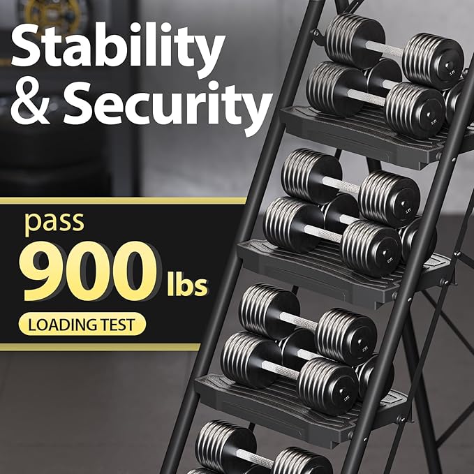 - 900lbs Capacity Folding Ladder: The size of this ladder meets the demand of most families, the size after folded is small, very easy to storage, you can place it in the corner or under the sofa, which can reduce storage space, the open size:17.64*34.68*58.27 inch, folded size:17.64*2.75*64.06 inch, max capacity: 900lbs (violent testing, do not imitate)