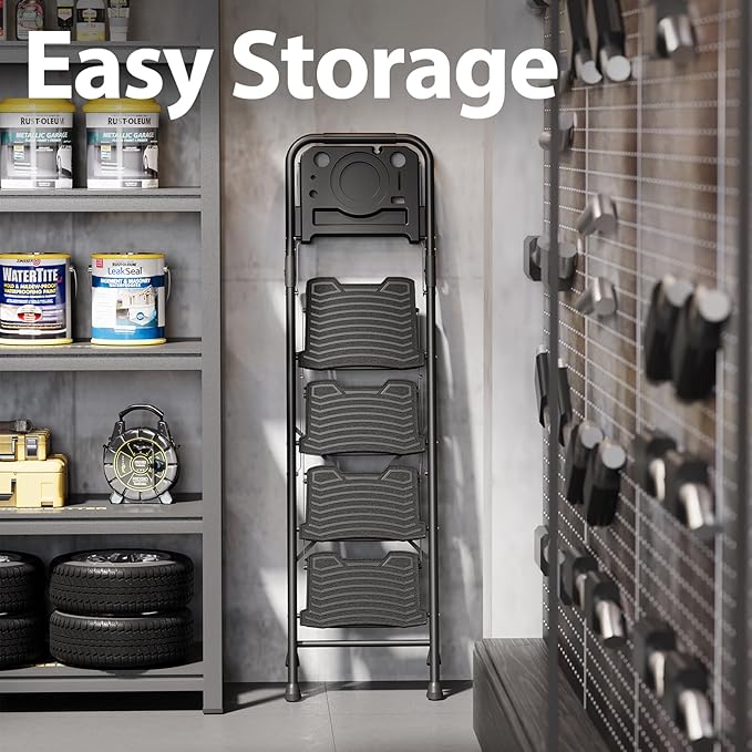 - Sturdy & Multi-purpose: The 4 step ladder is forming a stable triangular structure between the pedal and the fixing bar, and the back cross design enhances safety and stability, perfect for using in kitchen, pantry, bathroom, office, garage,etc.
