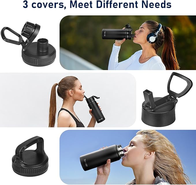 18oz Insulated Water Bottle with Straw&3 Lids Stainless Steel Water Bottles Kids Sports Metal Thermos Water Bottle Cup for School Vacuum Insulated Bottles Leak-Proof Travel Thermal (Black)