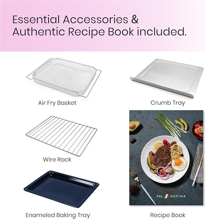 - [FAST, SAFE & EASY to USE] With 1750W of power and six heating elements, the VAL CUCINA Air Fryer toaster oven cooks 40% faster than traditional ovens. The even distribution of heat reduces preheating time by up to 30%, saving your valuable time in the kitchen. Our user-friendly digital display and analogue controls make cooking effortless and enjoyable. VAL CUCINA countertop oven boasts a variety of accessories: an Enamel Baking Tray, Wire Rack, Air Fryer Basket, Crumb Tray.
