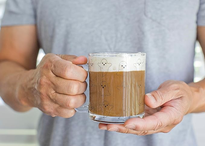 - Simple Elegance: Embrace the fusion of modern minimalism and playful ghosts on this glass mug. The clean lines and subtle design allow it to seamlessly fit into any setting, from your kitchen counter to your office desk.