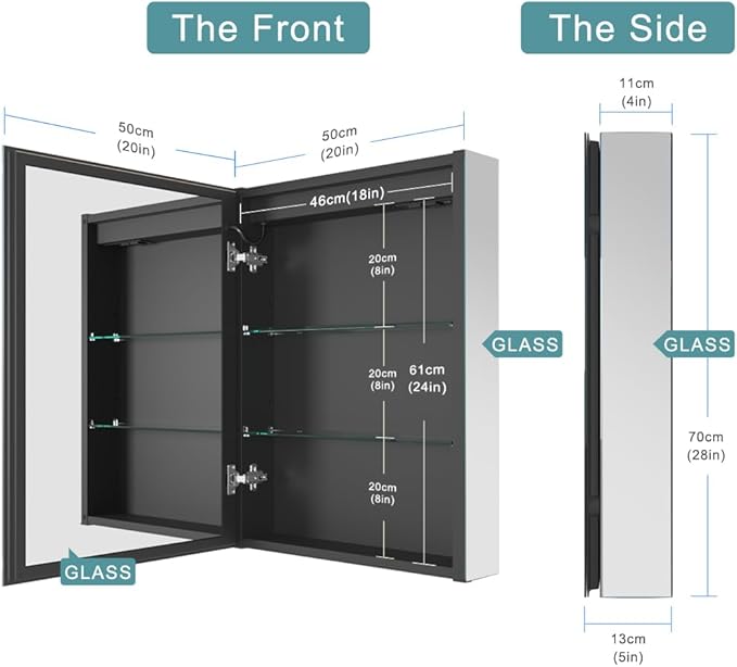 - [Better Defogging Function] Doing your makeup foglessly is just on touch away with the built-in defogger of the medicine cabinet. You no longer need to worry about the moisture on the mirror blocking your view. IP44 waterproof of the medicine cabinet ensures safety and durability in damp bathroom environment.