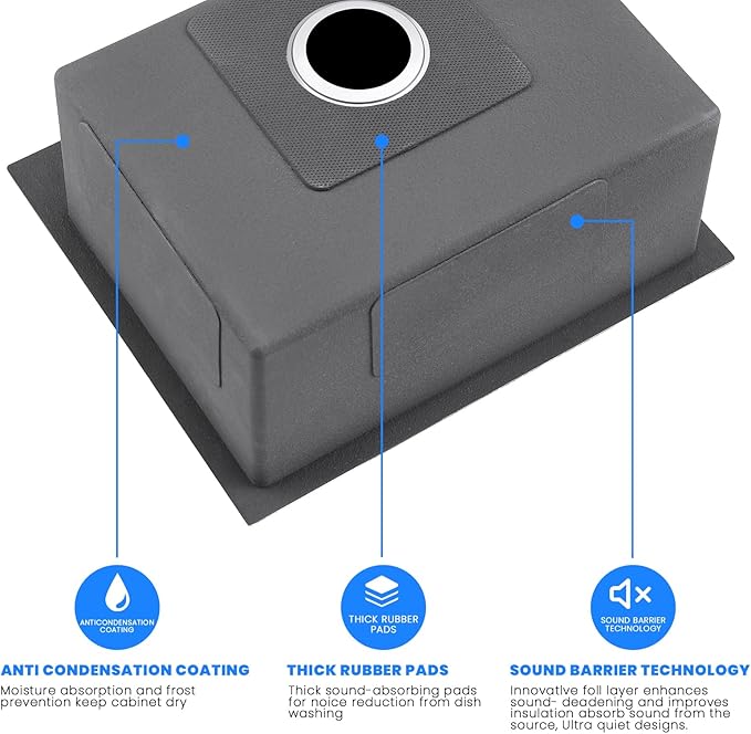 - 【Ultra-Quiet & Anti-Condensation Design】 3mm sound-absorbing undercoating and thick rubber padding are applied to significantly reduce noise from water and impacts. The anti-condensation coating helps prevent water droplets from forming on the sink's exterior