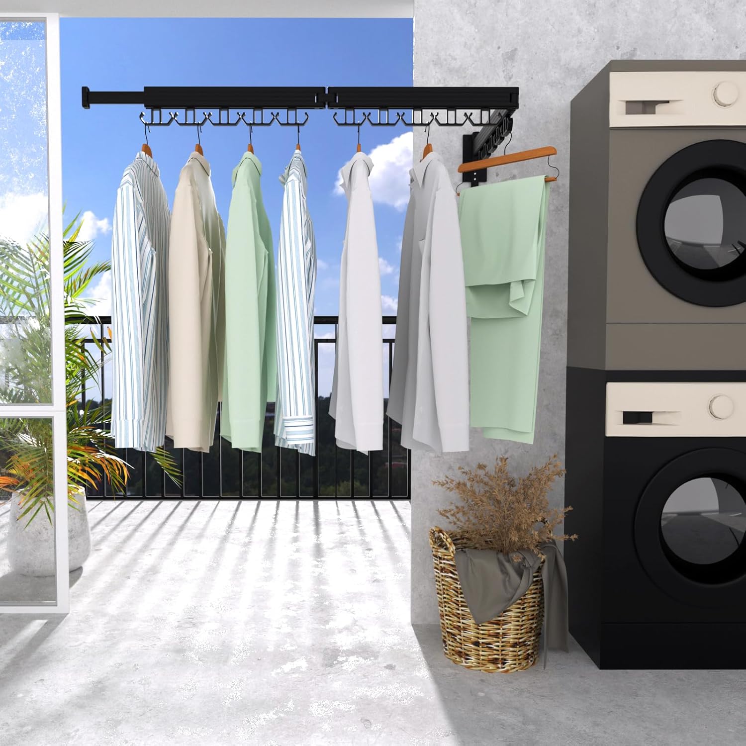 - ✅ Wall Mounted Drying Rack -- Our wall-mounted clothes drying rack will maximize your space, since it featuring 3 folding sections & a hidden telescopic rod. It is an ideal option for drying various garments such as shirts, towels, socks, hats, coats, suits, dresses, and much more. Its compact and stylish design efficiently aids in organizing your laundry room.