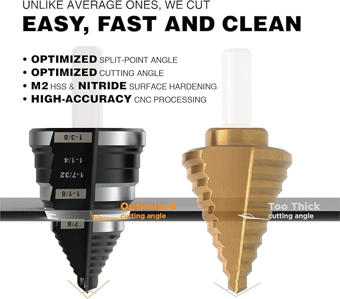 - [M2 HSS]: Cuts A LOT MORE CLEAN holes and much EASIER than average step bits. In general, M2 has 50% more Tungsten and 150% more Molybdenum, both of which are key elements in improving durability. Our additional Vacuum heat treatment and Nitride surface hardening treatment make the performance even better.