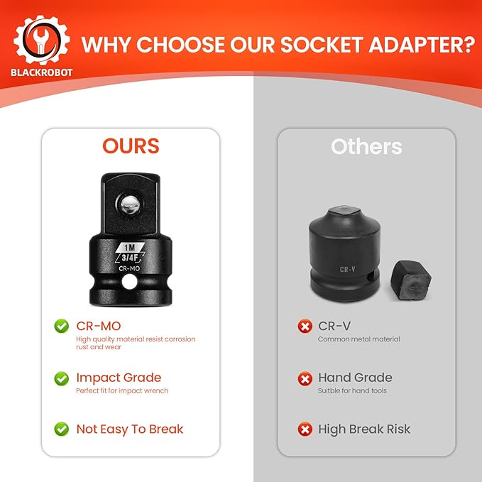 - PREMIUM CR-MO MATERIAL: The socket adapter is made of heat-treated forged Chrome Molybdenum Steel, it's corrosion-resistant and has ultra-high hardness. The thicker wall design can handle higher torque and prevent breakage