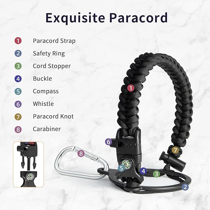 - Full-function Paracord: Brilliant paracord of matching colors bring out the bottle with a touch of youthful vibe. Compact compass and handy carabiner make the bottle the ideal survival kit for expeditions in the wild.