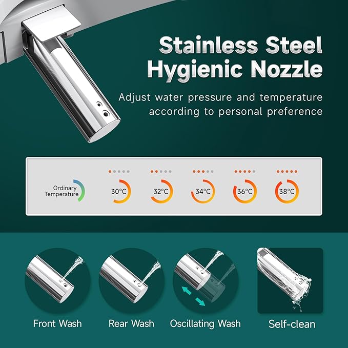 - 【Advanced Water Washing Options】The water washing function offers rear,front and oscillating wash modes, with adjustable water pressure across 6 levels. Instant access to warm water enhances your cleansing experience, allowing you to customize the pressure according to your preference.
