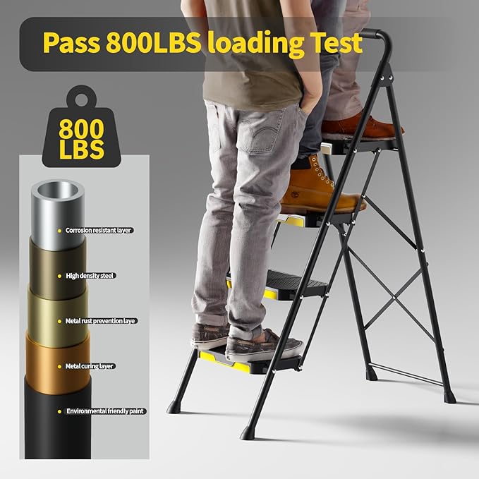 - 800lbs Sturdy Step Ladder: High quality 4-Step Ladder with the robust high-strength steel frame, which ensure outstanding stability and security, open dimensions: 18.1"L * 34.8"W * 49.5"H, folded dimensions: 18.1"L * 2.75"W * 54.9"H, max capacity: 800lbs