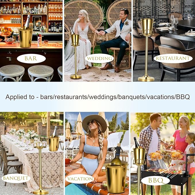 - 【Detachable bracket】A champagne ice bucket with a stand will not occupy the space on the desktop. Of course, you can remove the red wine cooler from the ice bucket stand. This standing ice bucket is not only suitable for indoor use, but can also be moved to outdoor use
