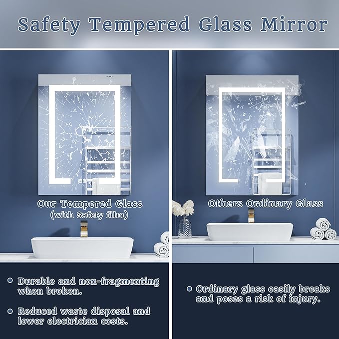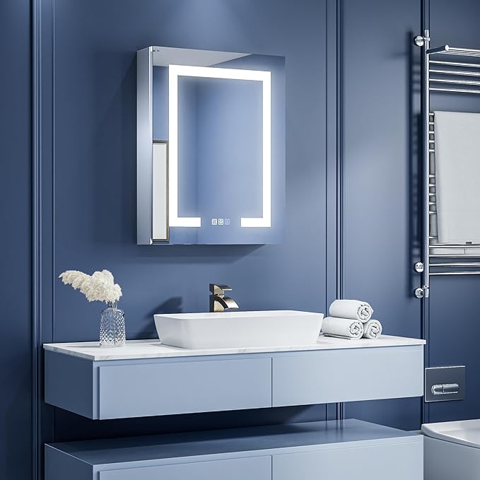 - 【Enhanced Defogging & Safety Protection】Experience clearer reflections with our newly upgraded medicine cabinet defogging technology. The mirror surface quickly warms to around 40°C, achieving a faster and safer defogging effect within minutes. For added safety, the defogging function automatically shuts off after 60 minutes or when the light is turned off, ensuring peace of mind. Built with an IP44-rated waterproof aluminum frame, this LED medicine cabinet delivers lasting durability and reliable protection in your bathroom.