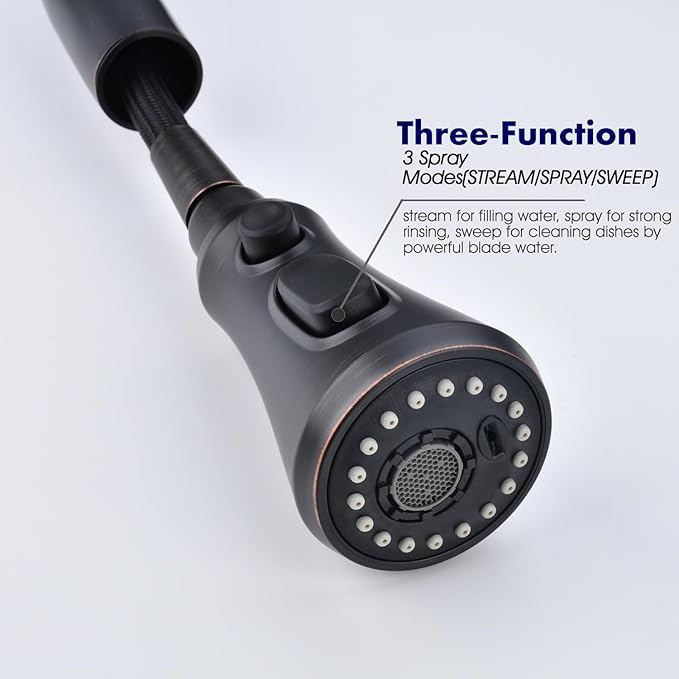 - 【3 SETTING MODES and 360 DEGREE SPOUT】 Three spray modes allow you to easily toggle from splash-free aerated stream to powerful pre-rinse spray and to wide range sweep at the flip of a switchs. High arch 360 degree swivel nozzle supply full range of washing for your kitchen sink. Single handle design integrates to control water temperature and flow volume easily.