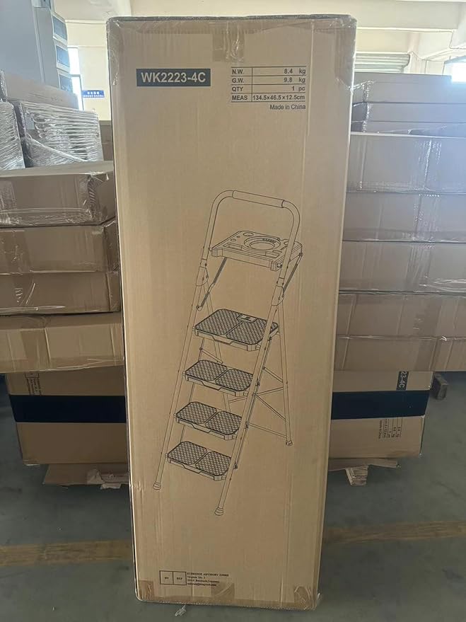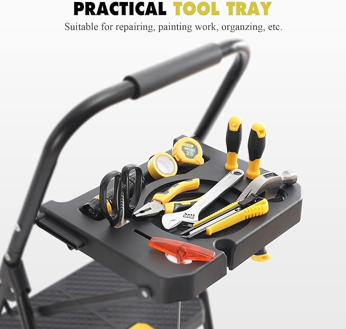 - Convenient Tool Platform: Foldable 4-step ladder comes with a practical tool tray, which can hold gloves, wrenches, paint buckets, light bulbs and other tools and equipment, rummaging through the tool tray, no need to climb up and down, improve efficiency and save energy, this ladder is your best working partner