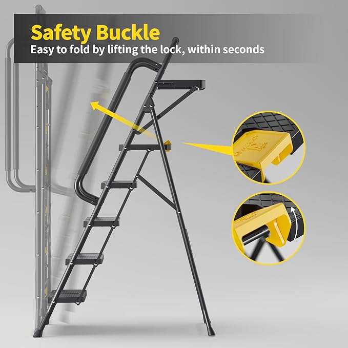 - Convenient Tool Platform: Foldable 5-step ladder comes with a practical tool tray, which can hold gloves, wrenches, paint buckets, light bulbs and other tools and equipment, rummaging through the tool tray, no need to climb up and down, improve efficiency and save energy, this ladder is your best working partner