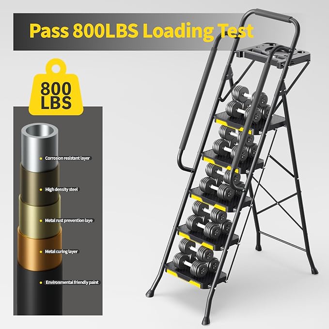 - 800lbs Sturdy Step Ladder: High quality 5-Step Ladder with the robust high-strength steel frame, which ensure outstanding stability and security, open dimensions: 21.5"L * 38.9"W * 64.1"H, folded dimensions: 22"L * 2.8"W * 71"H, max capacity: 800lbs (violent testing, do not imitate)