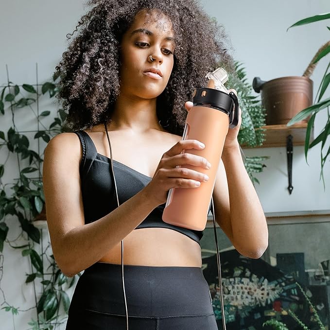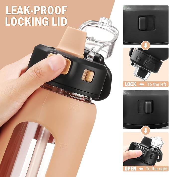 - WHAT'S IN THE BOX - The Drinking Bottle Set comes with a 24 oz water bottle covered with a silicone protective sleeve, 1 straw lid with locking, 2 tritan built-in straws and 1 straw cleaning brush. The locking lid allows for convenient one-handed drinking or pouring. One touch flip lid keeps drink surface covered and clean. These daily water intake bottles are ideal for home, office, school, sports, biking, hiking, gym, travel, or on the go, and also car cup and gym equiptment friendly.