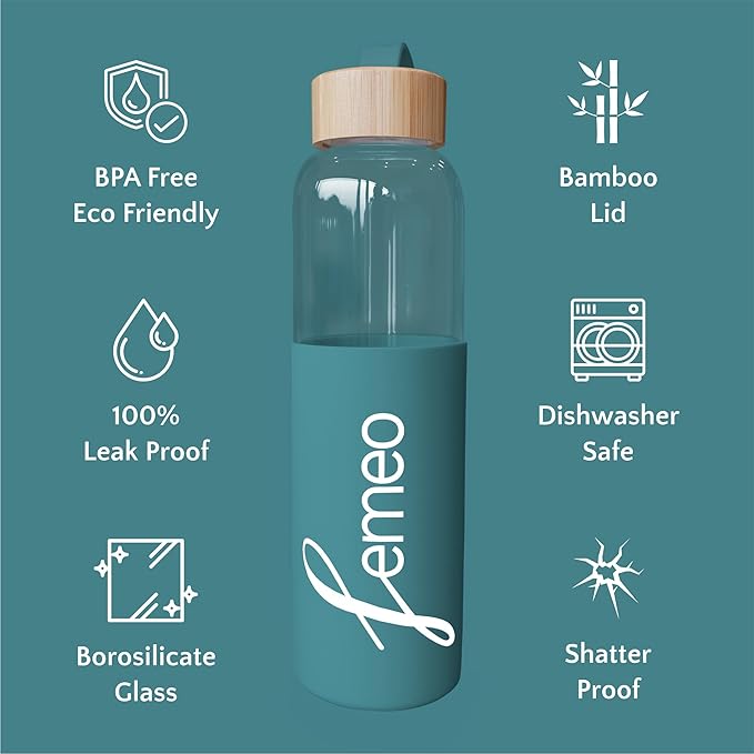 Femeo® Glass Water Bottle for Women | Eco, Yoga & Gym Friendly, 18oz | 100% Leakproof, BPA-Free, Dishwasher Safe, Borosilicate Drinking Glass Bamboo Sports Cap Teal