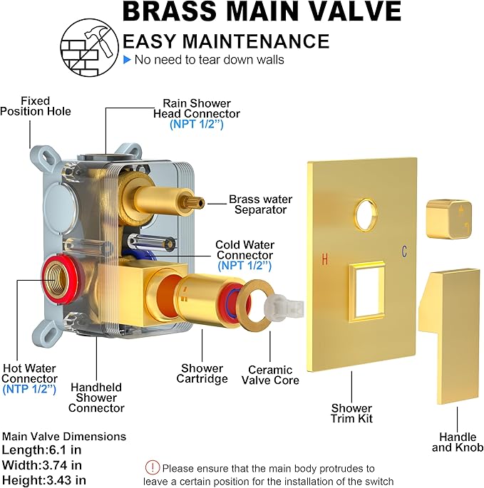 - QUALITY PROMISE: All-metal sturdy construction. Mixing valve made of solid brass, 304 stainless steel rain shower head and self-cleaning silicone nozzles. Provide excellent water coverage, anti-clogging, easy to clean, anti-oxidation and corrosion resistance
