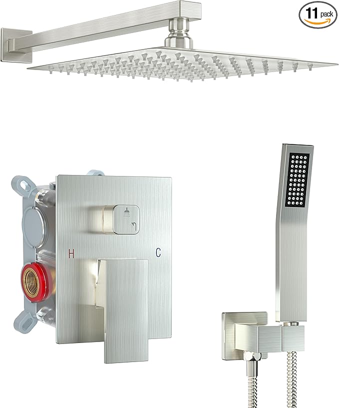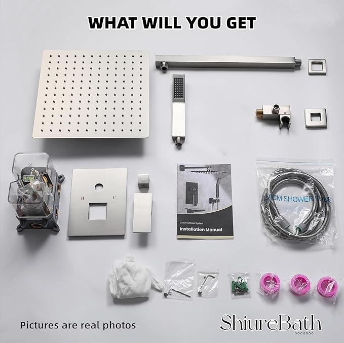 - WHAT WILL YOU GET: Detailed instructions in the package, this shower faucet set with a valve easily according to the instructions. Shower system include: 10" Square rain shower head(304 stainless steel), handheld shower head(Brass), 15.7" shower arm(Metal), 59" shower hose(304 stainless steel), shower holder(Brass), water control valve(Brass). If you need help, please contact us 626-781-1137 (Pacific time from 9: 00am to 5: 00pm)