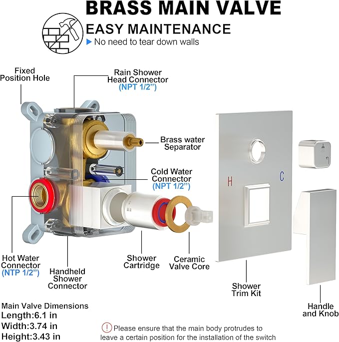 - QUALITY PROMISE: All-metal sturdy construction. Mixing valve made of solid brass, 304 stainless steel rain shower head and self-cleaning silicone nozzles. Provide excellent water coverage, anti-clogging, easy to clean, anti-oxidation and corrosion resistance