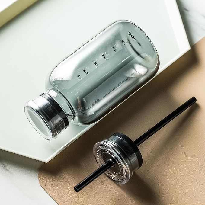 - 【Excellent Design】Bottle minimalist design with time markers The bottle made of borosilicate glass is clear and so you can always see what's inside and easy to carry,The bottle comes with 2 caps, one with a straw, one with a hole in the lid can be used perfectly, and the other with no hole can make it sealed, and the two caps can be switched freely, which is very convenient to use.