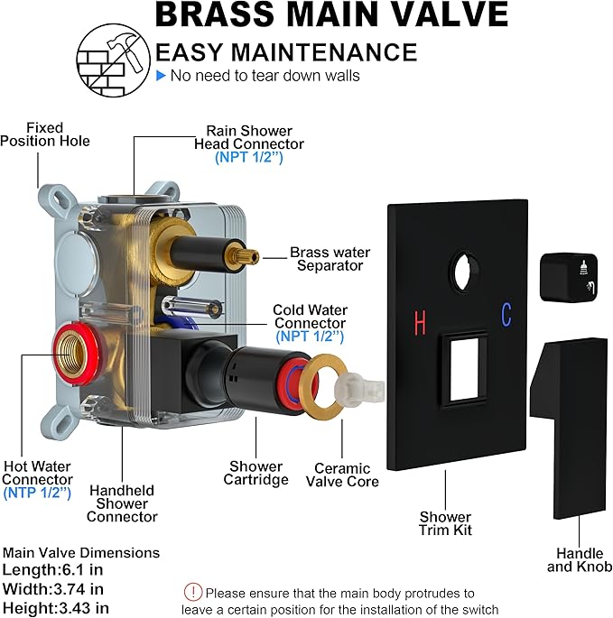- QUALITY PROMISE: All-metal sturdy construction. Mixing valve made of solid brass, 304 stainless steel rain shower head and self-cleaning silicone nozzles. Provide excellent water coverage, anti-clogging, easy to clean, anti-oxidation and corrosion resistance