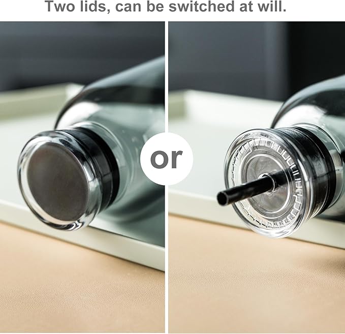 - 【Excellent Design】Bottle minimalist design with time markers The bottle made of borosilicate glass is clear and so you can always see what's inside and easy to carry,The bottle comes with 2 caps, one with a straw, one with a hole in the lid can be used perfectly, and the other with no hole can make it sealed, and the two caps can be switched freely, which is very convenient to use.