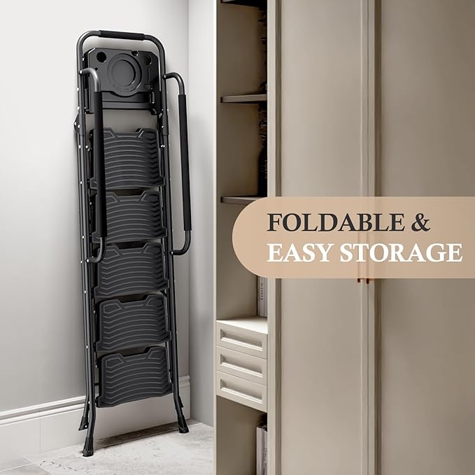 - Convenient Tool Tray: This Folding 5-step ladder features a practical tool platform, that's integrated with the ladder, you can put repair tools, paint buckets, gloves, spanners, wrenches, paint buckets, light bulbs on it., no need to climb up and down, increase efficiency, great for those looking to decorate or make home repairs