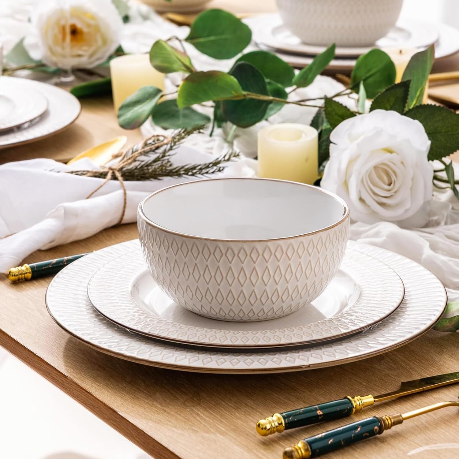 GBHOME Ceramic Dinnerware Sets,12 pcs Embossed Elegant Stoneware Plates and Bowls Sets, Housewarming Wedding Gift | Dishwasher & Microwave Safe | Dishes Set Service for 4