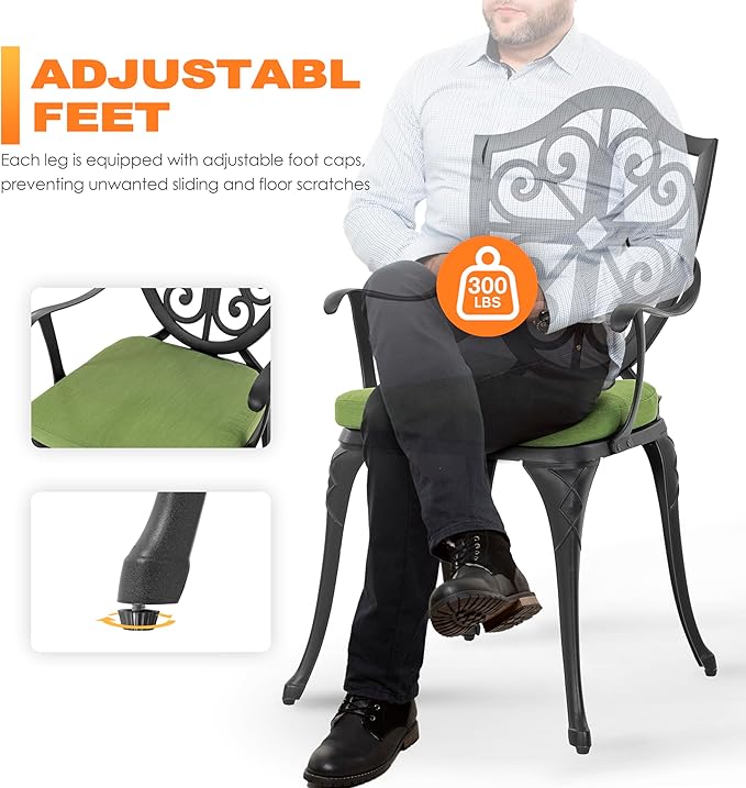 - EASY ASSEMBLE: Easily assembled with hardware packs of this 3 pieces cast aluminum patio bistro sets, adjustable feet keep outdoor patio set stability anytime and anywhere and prevent unwanted sliding and floor scratches