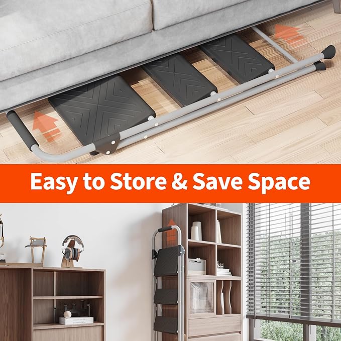 - Portable and Space Saving: This folding step stool folds to just 3 inches, making it easy to store against walls, in corners, under beds, or in closets. Made from high-quality lightweight steel, it's easy to carry with just one hand.