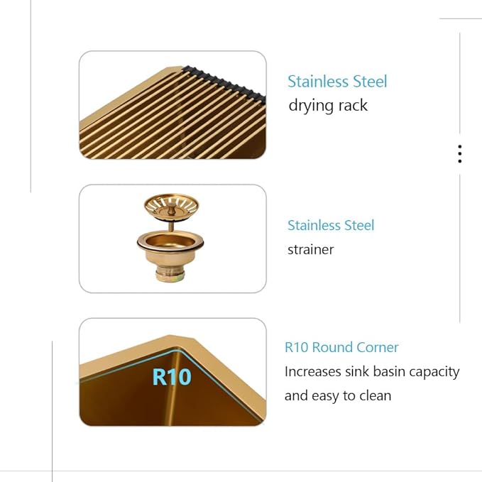 - đăSurface TechnologyăMatte gold kitchen sink with colored finish is applied as an outer layer using an innovative nano-PVD technique that makes it incredible tough and resistant to wearing or peeling, smooth surface for water flowing down without trace, anti-freezing heat and non-seepage water ,1000â high temperature do not fade