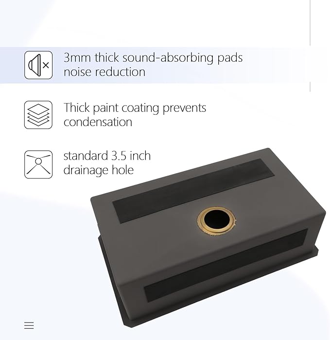 - đăPatented DesignăX-shaped diversion water design, with a gently sloped bottom that prevents standing water inside the bowl fast drainage, no blockage. Heavy-duty 3-mm thick rubber pads minimize noise and reduce condensation, well protect sink cabinet from condensation damage and provide you a quiet kitchen environment