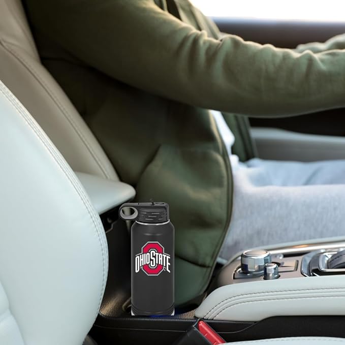 Ohio State University 32oz Stainless Steel Double Walled Black Beverage Bottle with Flip Straw Spout - College Gear for Playoff Season – For Office, Home or Auto – Show your Buckeye Pride