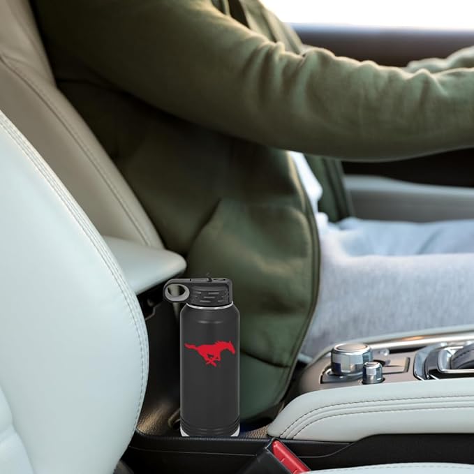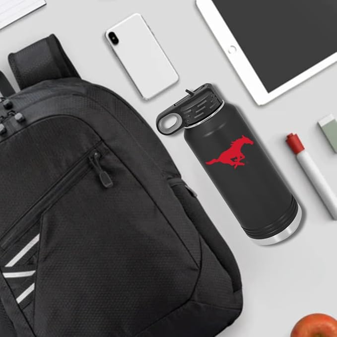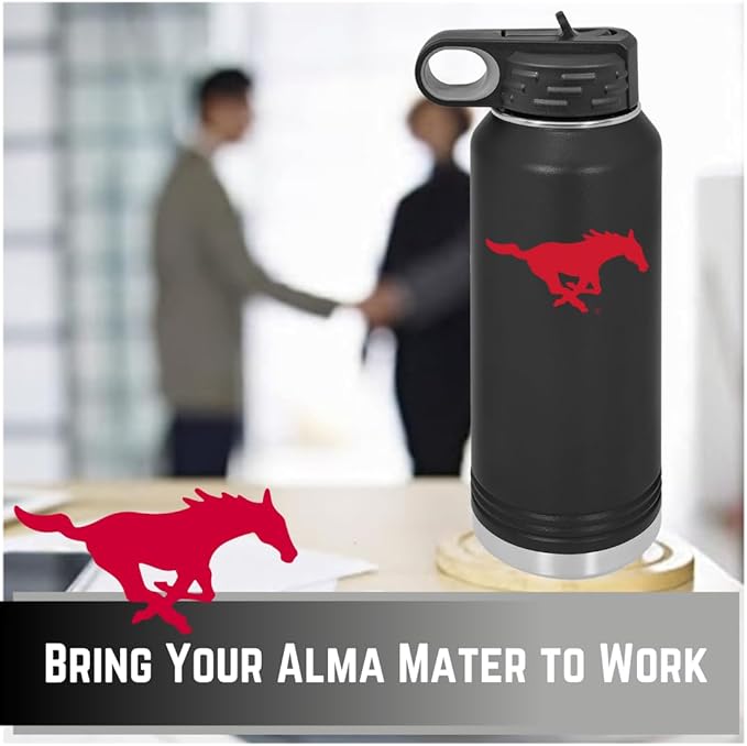 Southern Methodist University 32oz Stainless Steel Double Walled Black Beverage Bottle with Flip Straw Spout - College Gear for Playoff Season – For Office, Home or Auto – Show your Mustang Pride