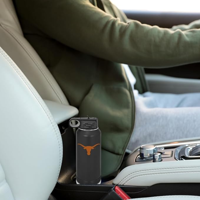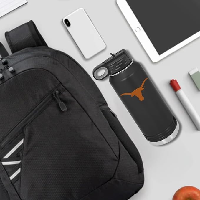 University of Texas at Austin 32oz Stainless Steel Double Walled Black Beverage Bottle with Flip Straw Spout - College Gear for Playoff Season – For Office, Home or Auto – Show your Longhorn Pride
