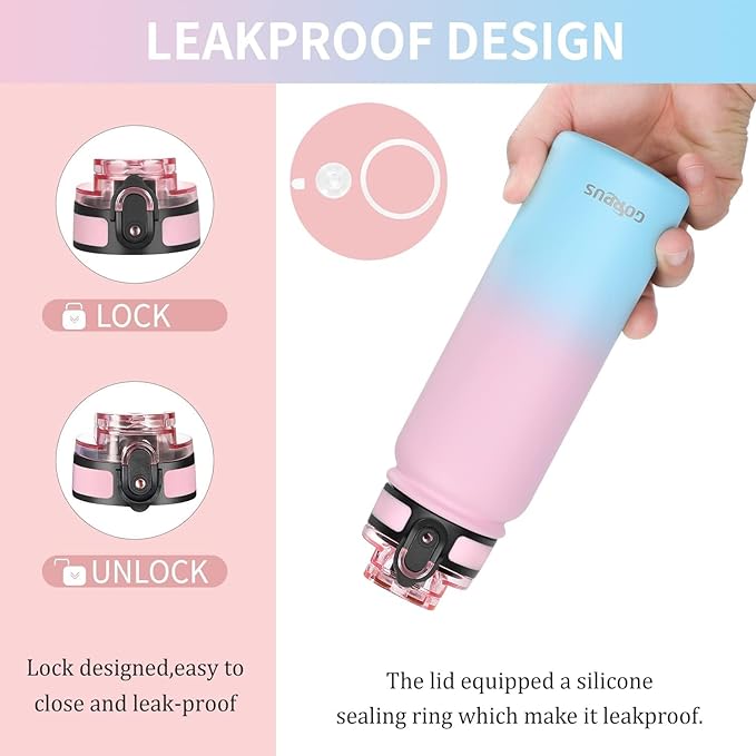 GOPPUS 20 oz Kids Water Bottle with Straw Wide Mouth Lid Leak Proof Double Walled Insulated Stainless Steel Water Bottles Stickers for Boys Girls School (Pink Blue 1 Lid)