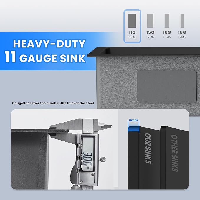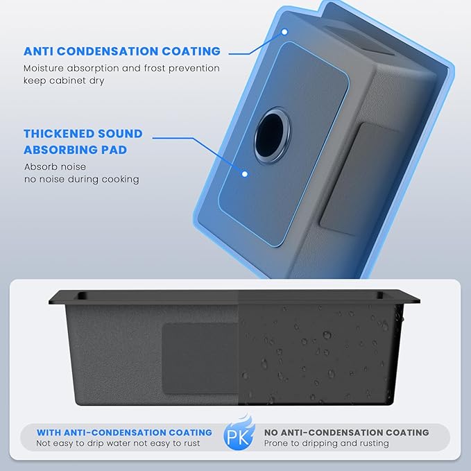 - 【Noise Cessation & Moisture Barrier】Use 3mm sound guard undercoating and thick rubber padding, covering more than 90% of the sink area,reducing the sound of running water and absorb sound from the source, Ultra quiet designs. Anti-condensation Coating, isolate condensate