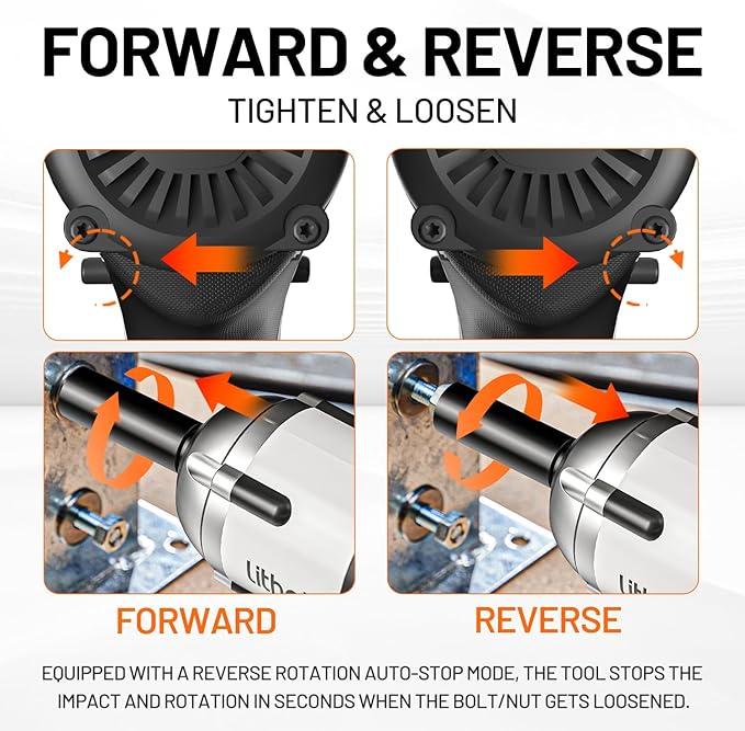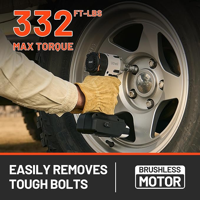 - 【Powerful Engine】Litheli cordless impact wrench with brushless motor delivers an impressive 330 ft-lbs (3983 in-lbs / 450 Nm) torque. Allow you tighten or loosen various nuts and bolts easily. including automotive repairs, major construction projects, equipment maintenance and product assembly.