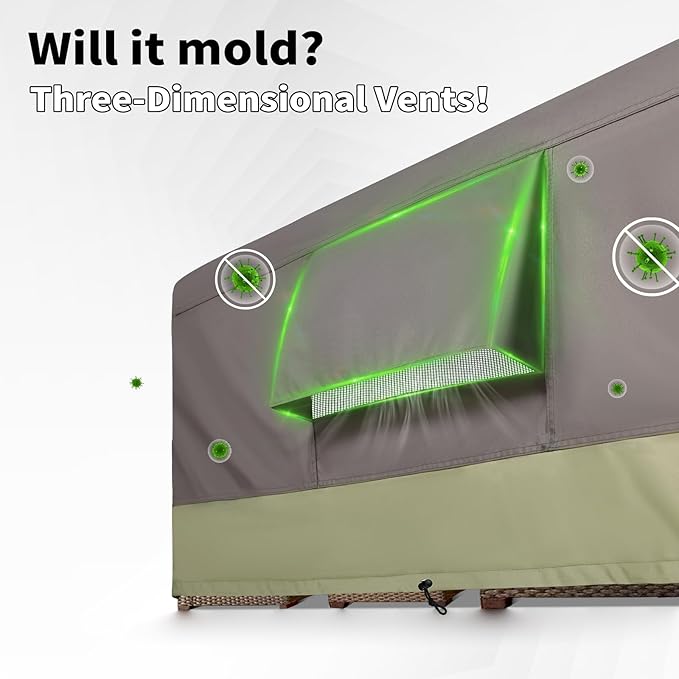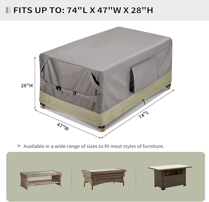 - Dimension & Large Three-Dimensional Air Vents- The rectangular patio furniture covers is 74L x 47W x 28H inches. Please carefully measure your furniture before adding it to cart to ensure a perfect fit. Our three-dimensional air vent on two side help speed up inner air circulation which helps keep your furniture dry and prevents it from becoming moisture
