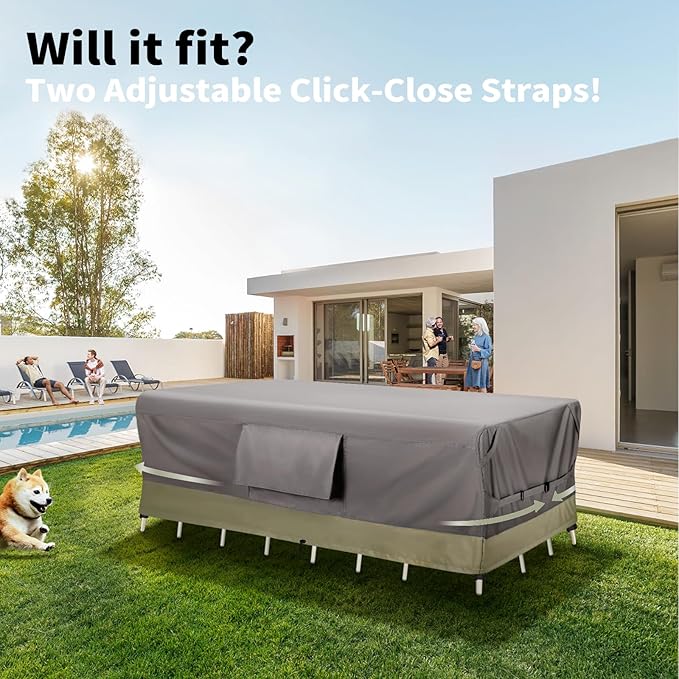 - Easy to fold and store- Our outdoor patio table covers is made of lightweight, soft, but stronger material so that you can easily fold and store it on your own. What else? We have specially designed 2 adjustable click-close straps to assist you in reusing and storing it more conveniently