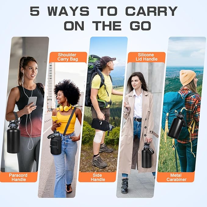 Insulated Water Bottle 64 oz, Half Gallon Water Jug Cold 48H, BPA Free Stainless Steel Bottles with Straw/Chug 2-in-1 Lid, Bag, Paracord Handle, Silicone Boot, Sports Gym School Metal Flask