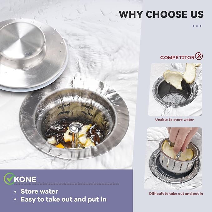 - 3-in-1 Garbage Disposal Flange: The removable deep strainer basket catches more food waste. Sink stopper can be used to plug the flange when storing water, making it easy to wash fruits and vegetables. Rubber gaskets removable and easy to clean.