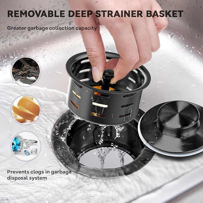 - 3-in-1 Garbage Disposal Flange: The removable deep strainer basket catches more food waste. Sink stopper can be used to plug the flange when storing water, making it easy to wash fruits and vegetables. Rubber gasket is removable and easy to clean