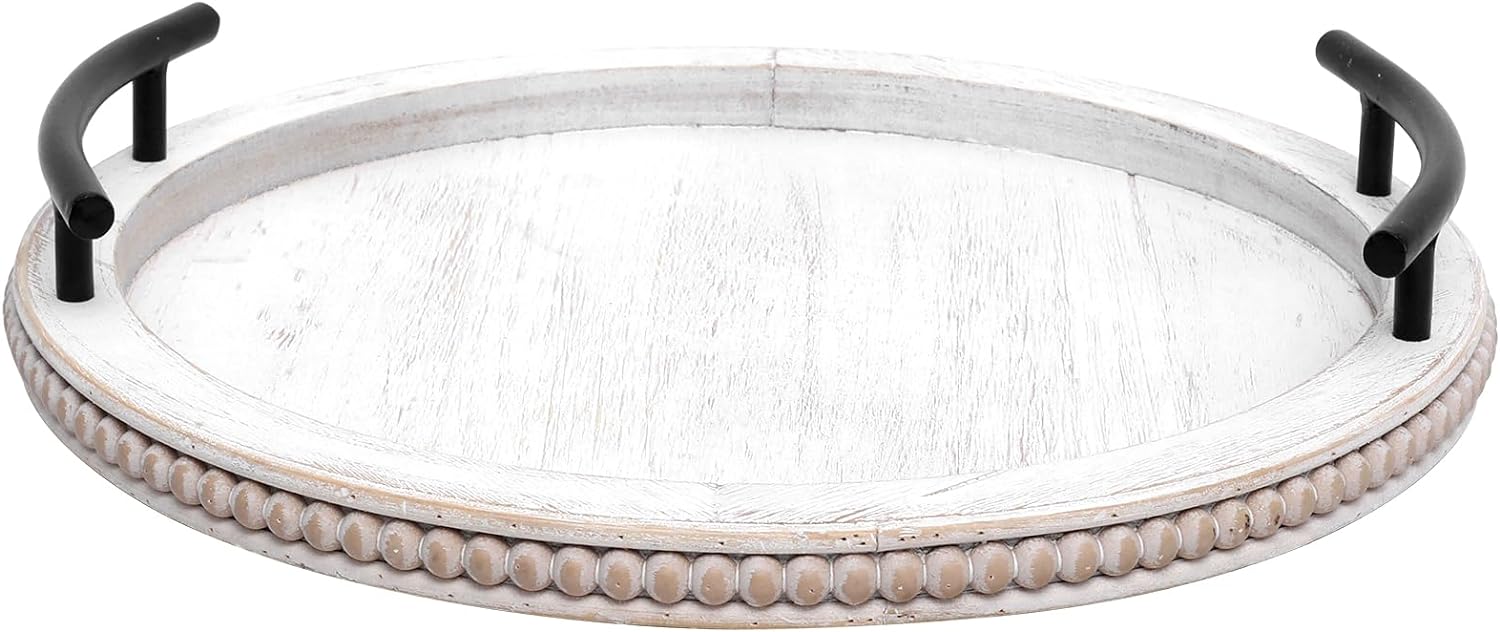 SwallowLiving White Wooden Beaded Serving Tray with Handle Decorative Rustic Whitewashed Tray for Coffee Table Farmhouse Round Tray for Kitchen, Living Room and Bedroom