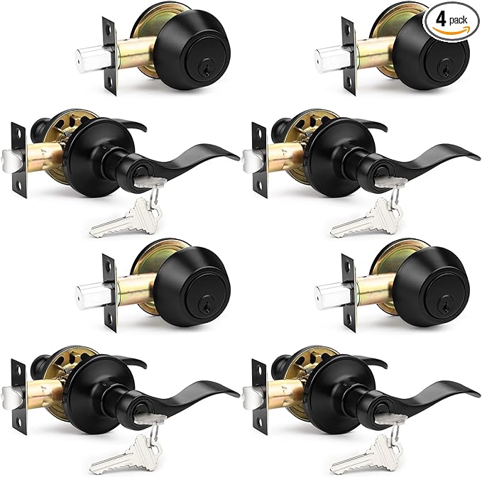Probrico Front Door Handle and Single Cylinder Deadbolt Set, Black Exterior Door Handle with Deadbolt Lockset,Wave Reversible Door Lever Locks with Deadbolt Set, Keyed Alike 4Pack