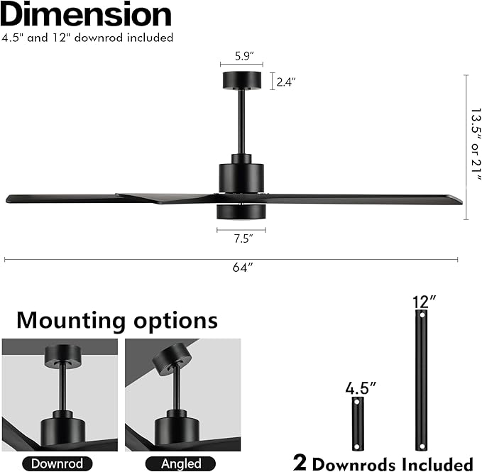 - MADE FOR ANY SPACE: The 64-inch blade span makes this ceiling fan perfect for spaces like living rooms, bedrooms or larger rooms (suitable for damp places). 2 down rods (4.5” and 12” long) are included to match different ceiling heights.