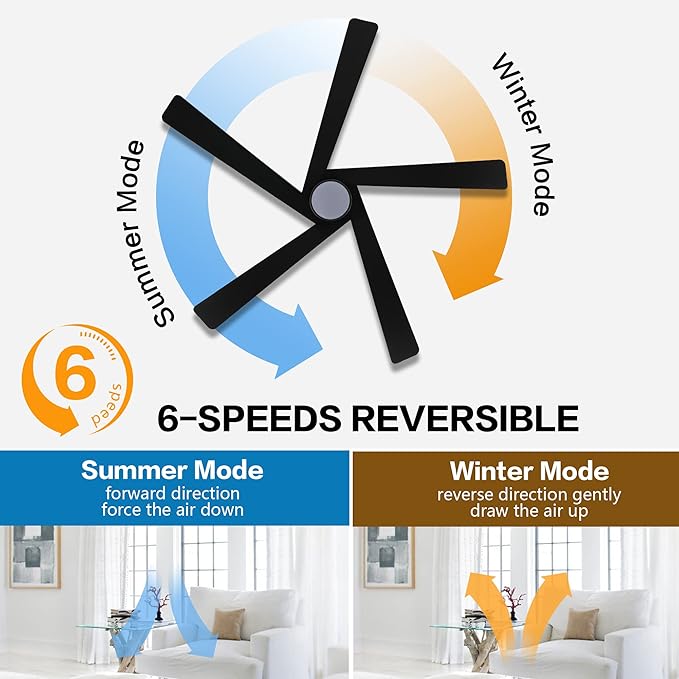 - 6 SPEEDS DUAL-DIRECTION FAN: The powerful ceiling fan operates on 6 forward and reverse speeds (easy to adjust with the included handheld remote). Its quiet, reversible motor allows it to turn your room into an oasis in summer as well as warming you up during winter.