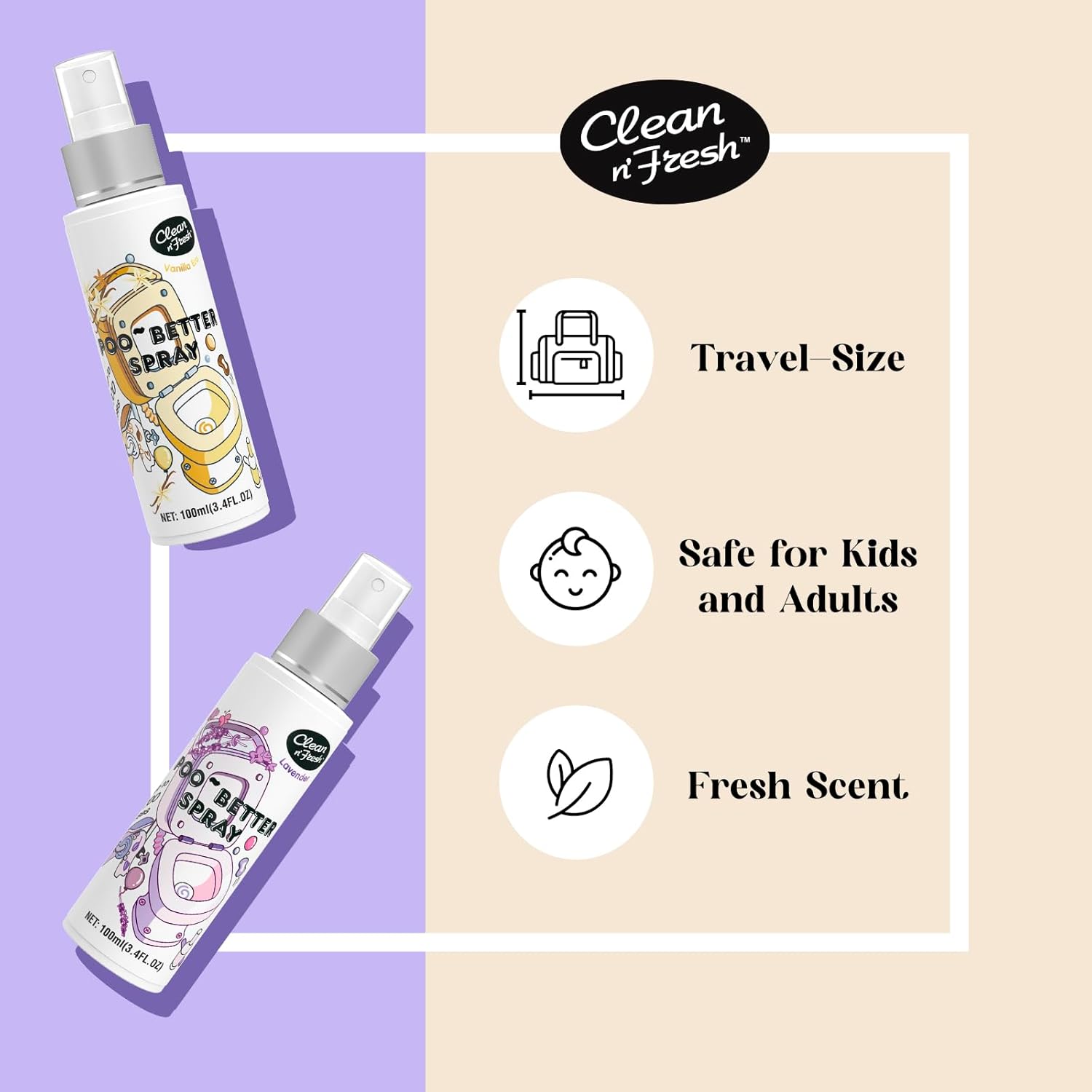 Clean-n-Fresh Toilet Spray 6.8 Fl.Oz, Vanilla Scent, Natural Plant Essential Oil Air Freshener & Odor Eliminator